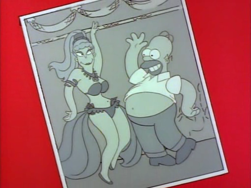 The episode starts out pretty slowly, with Bart sending away for a miniature spy camera in the mail. In the six-month gap between the delivery, we see two similar morning scenes of Homer and Marge in the bathroom. Homer being horrified at his weight (“239 pounds?! I’m a blimp!”) and then doing pathetic attempts at crunches is funny, but then seeing him do it again six months later with the same degree of outrage is even funnier (“239 pounds?! I’m a whale!”) We also find that Homer’s old assistant (now his supervisor after the six-month time jump) is having a bachelor party, which Homer insists is a classy affair (“A tea and crumpet kind of thing.”) The party inevitably turns blue, much to the chagrin of the groom and his father, thanks to Princess Kashmir, “Queen of the Mysterious East.” Also, said party is also taking place at the Rusty Barnacle, where Marge and the kids are out to dinner. Bart slips away from the table and happens to peek into the party, and with his camera, takes the immortal shot of his father with the exotic dancer.