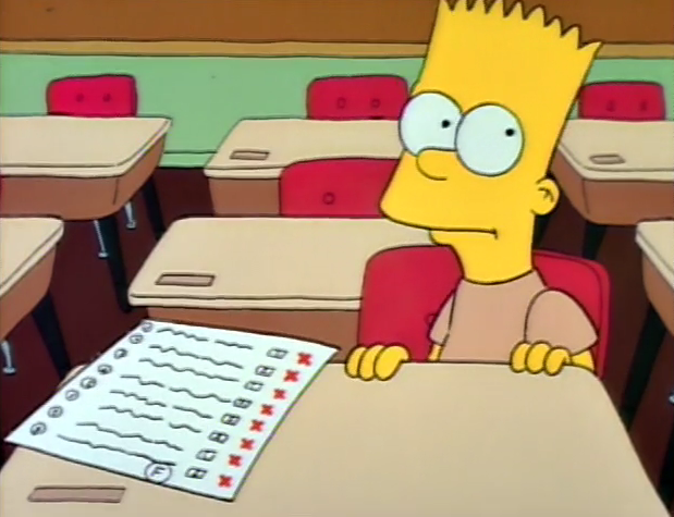 Fantastic episode and a great start to the season. You really feel for Bart in this episode, especially at the ending. I think all of us have experienced something like that before: you study really hard, and you do poorly on the test anyway.