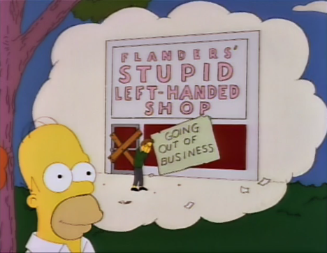 We start with an invitation to the Flanders backyard for a barbecue, which promises to have “incredibly Ned-ibles” and “Maude-acious vittles.” Homer adamantly refuses to go, but in the end, his stomach wins over his mind and he scurries next door, grabs a plate of burgers and sits by himself under a tree. So Homer’s pretty rude right from the get-go here. With his guests gathered, Ned announces that this event is in celebration for his new business venture: a new store at the mall that caters to left-handed folks like himself, dubbed “The Leftorium.” Later, upon breaking a wishbone with Ned, Homer gets the larger piece, and wishes that Ned and his store go belly-up.
