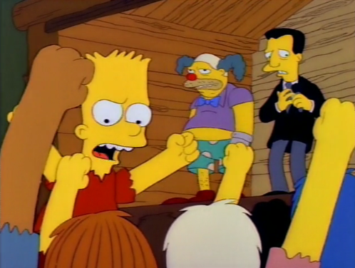 – Barney posing as Krusty is great of course (“I am so Crunchy the Clown!”) as is a panicked Mr. Black yelling at the bullies for not breaking the kids’s spirits (“You broke nothing!”) They worked really hard to abuse these grade schoolers, for reasons that escape me, but dammit, they did their best.