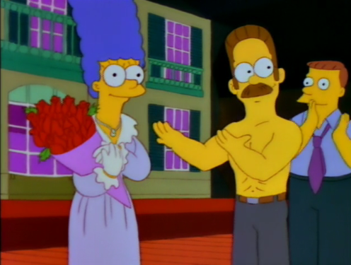 – Ned is a great addition to the cast; first in his admission that he played Blanche back when he attended an all-boys school (later he comments, “not to be an armchair Blanche” in teaching Marge how to properly break a bottle). Him playing Stanley is a wonderful contrast, and one Ned doesn’t shy away from. I feel Ned in the later seasons would be taking notes on all the offensive material in the play like a media watchdog, but here, he’s a normal guy playing a role. He takes direction, responds, “Rodger dodger!” and proceeds to throw Marge onto the bed… and his heart melts when Maggie takes his glasses. It’s completely in character, and makes Ned more like a real person than the Christian extremist he would later become.