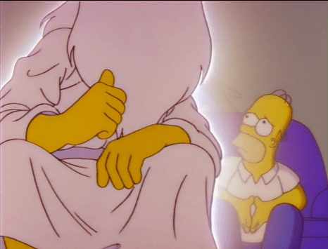 – The showcase of this episode is Homer’s dream of meeting God, who has five fingers, as if He transcends the crude four-fingered animated characters beneath Him. I love His disappointment with Lovejoy, apparently not knowing whether St. Louis has a football team or not, and His parting words to Homer (“Now, if you’ll excuse me, I have to appear in a tortilla in Mexico.”) Also immensely quotable is Homer’s description of the Almighty (“Perfect teeth. Nice smell. A class act, all the way.”)