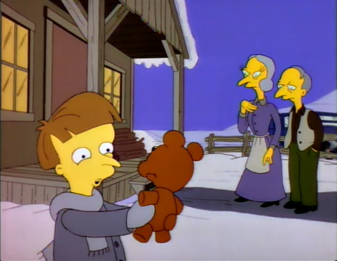 – I’m not sure what Krusty is doing living in a residential neighborhood, nor why he appears to have sinister motives in giving away the trampoline. Regardless, him sitting on the porch aiming a shotgun at Homer when he tries to return it is hysterical (“You just keep right on drivin’.”)