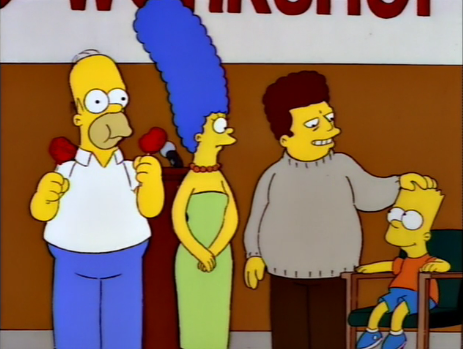 The through-line emotion that brings us to act two is that Marge fears she is too much of a nagger, having been against the trampoline from the beginning. The segue is fair enough, especially considering the insanely disconnected act ones we’d see later on. Marge, Homer, and later the whole town are hooked onto self-help expert Brad Goodman, Albert Brooks’s most forgettable role, but still a strong outing. He delivers ridiculous lines with such a level of professionalism and calmness. At Goodman’s seminar, he latches onto the cheeky outburts of Bart, exemplifying him as a well-adjusted free spirit, turning the boy’s half-hearted excuse of “I do what I feel like” into a mantra to live by. This sort of becomes a plot line, where Bart feels a lack of identity in a town desperately trying to be as rebellious and irreverent as him. It never seems to amount to much though, as there’s no real concrete resolution to the story. The climax sort of ends on a joke and we have a scene of the family on the couch trying to recap the show, a la “Blood Feud” or “Rosebud.”