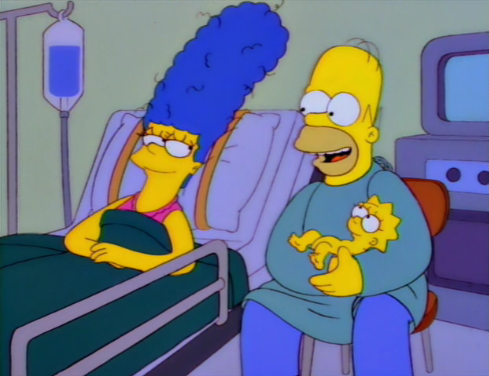 – There’s another real cute moment toward the end where Homer is lovingly fawning over his new baby, and Marge, exhausted from her birthing ordeal, gives a quiet sigh of contentment. Homer urges his wife, “Come on, Marge, show a little enthusiasm!”