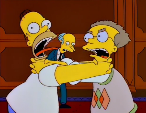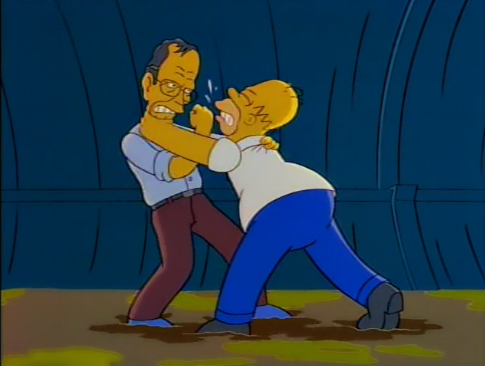 – The Homer/Smithers fight is great, especially the bit where Smithers’s fist gets stuck in Homer’s flab, which Homer delights in, who proceeds to just smush his hand against Smithers’s face, tilting his glasses.
