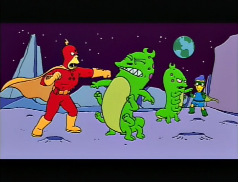 – The best scene of the episode is the shifty editor claiming they can finish the movie by splicing together shots of Milhouse with new footage. So Wolfcastle and Milhouse are surrounded by some thugs underground. Cut to Wolfcastle whispering to his sidekick off screen. Cut to the two of them in a bright open field so Milhouse can say his line. Cut to Wolfcastle again whispering, “Are you ready?” Cut to Milhouse on a green room couch, with a flat, “Yes.” Cut to the two of them punching aliens on the moon. Absolutely stellar work (“Seamless, huh?” “You’re fired.” “And with good cause!”)