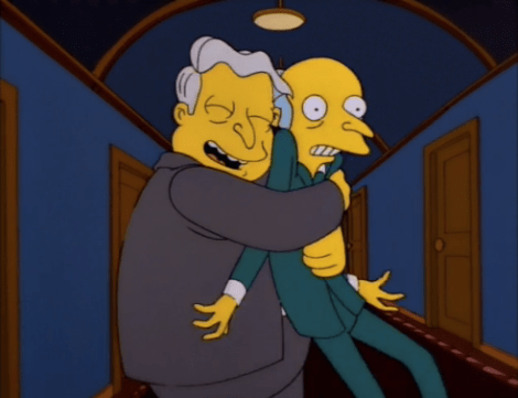 – My favorite scene is definitely when Grampa walks in the door, turns to put his hat on the rack, turns back to see Bart, turns back to get his hat, and then out the door. All while whistling. He then peeks his head in and asks, “Is your name ‘Bart’?” Bart only has to nod. Grampa demands if his father knows he’s working there. Bart says it was Homer’s idea. Grampa is convinced, walking back in asking for a whiskey sour.