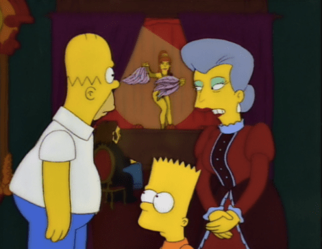 – I love how Skinner tries to cover his tracks when he realizes that Bart is the doorman at the burlesque house, and then later when the Lovejoys and Flanderses show up at Homer’s door. Helen Lovejoy tells them Skinner found out about Bart, who then pops up from below, almost like he was hiding in shame, to defend himself (“That’s true, but I was only in there to get directions on how to get away from there.”)