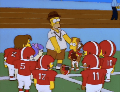 So here’s another episode with a somewhat interesting story and a lot of great gags and laughs throughout… but again, tainted by slightly early glimmers of Jerkass Homer. Is this going to be a consistent theme this season? When a local health fair illuminates the fact that Springfield’s kids are overweight, many of them are hooked into peewee football. Flanders acts as team coach, but when Homer’s incessant and overbearing heckling digs into him a bit too deep, he resigns and makes him the coach. Although the rough and ruthless Nelson is essentially carrying the team, Homer goes for nepotism and puts all his stock into Bart as the new quarterback, despite the boy’s objections.