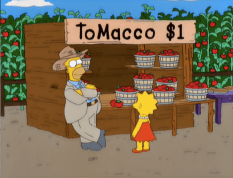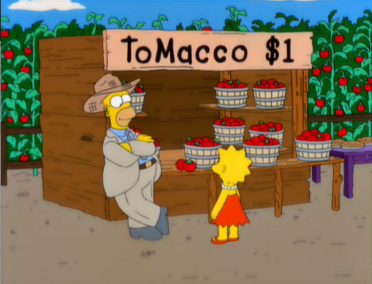 Homer and the family escape their house when the colonel arrives to duel and they must find a place to hide out. They end up at the old Simpson family farm, and must adapt themselves to a new way of life. Why he figures he has to grow crops and be a farmer now and not just drive to a convenience mart and stock up on junk food isn’t exactly clear, but it’s easy enough to hand wave. The jokes in the middle half are kind of hit and miss. You’ve got the most wildest risque joke in the show’s history (Sneed’s Feed and Seed, Formerly Chuck’s) and the condescending rival farmers, but the writers also seem to think tractors repeatedly falling on Homer to be comedy gold. Hoping to kick start the growing process, Homer loads up a pesticide sprayer with plutonium, and with his random assortment of seeds he planted, ends up tending to an entire field of tomacco, the unholy hybrid of tomato and tobacco. And wouldn’t you know, people just can’t get enough. Bart acknowledges it tastes terrible, “but it’s smooth and mild. And refreshingly addictive!”