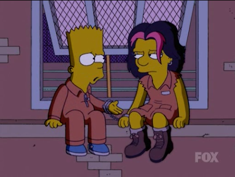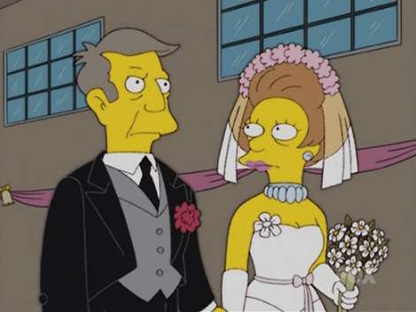 I don’t like this idea. I really don’t. “The Way We Was” was perfect, where Homer first lays his eyes on Marge, and he’s completely bowled over at this vision of beauty he’s never seen before. Social circles are weird like that, you go through high school and flip through your old yearbook and you see people you have no fucking idea were in your class. But in these new flashbacks, Homer has been friends with Lenny, Carl and Moe from the beginning, and Marge hangs out with the three female characters the series has. And now we see that the two met long, long before that fateful afternoon in detention. Great effort was made so that neither would remember the other’s identity. Homer makes up a fake name to impress Marge, but on the flip side, why does he never ask her her name? That’s normally the first thing you’d ask a girl you like, right? There’s also this weird thing going on with insisting that Homer and Marge have never kissed or been with anyone else, which ultimately I have to agree with. Homer was a loser and Marge was a prude, I don’t think either of them had many relationships before they crossed paths.