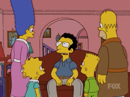 – A latter-day Simpsons staple joke seems to be over-explanation, which we see several times this episode, from Moe (“Now, in a step I should have perhaps taken initially, let me look up the value of that bottle in this wine collector’s guide,”) and Chief Wiggum (“Maybe someone else is here, and maybe he’ll step forward and admit to being the real culprit!”) These lines don’t work because they feel completely unnatural. No one talks like this at all. Ever.