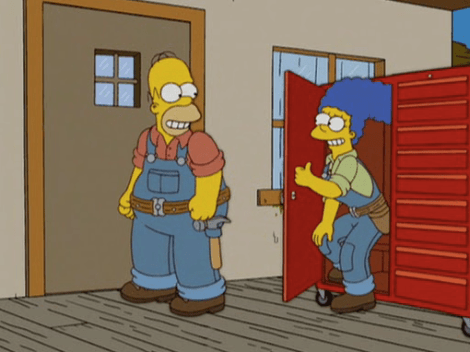 – The scene with Lenny and Carl ends up feeling incredibly awkward. The two of them inexplicably make sexist remarks, causing Marge to murmur angrily. The gag is that it sounds like a buzz saw in the tool box, but then it just gets extended longer and longer as the two bang on it and rock out. It’s like a full minute of Marge murmuring nonstop as these two imbeciles roughhouse the box she’s stuck in. Then later we find that it was rolled down a steep hill, seemingly endangering her life. And Homer doesn’t seem to really mind too much, simply giving a paltry apology before immediately ignoring Marge’s plea for them to come clean and continuing to belittle her (“Nice job installing this wall chart bracket. If the kids ask, I did it.”)
