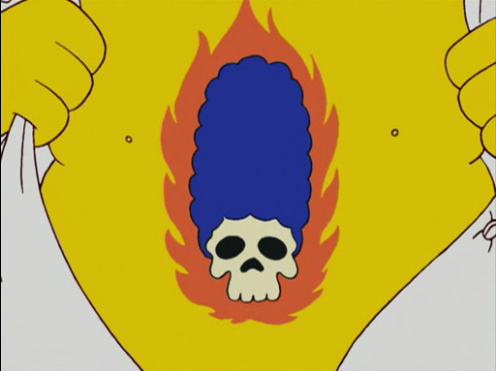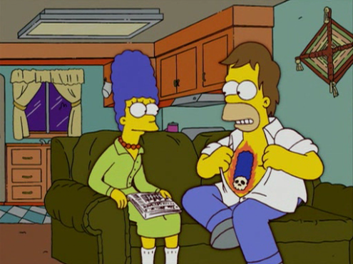 Homer walks in, going to show off his new tattoo. He opens his shirt…