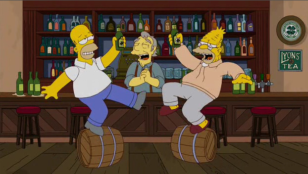 1. Maybe I’m nitpicking, but the expressions on Homer and Grandpa in that picture don’t seem to fit what they’re doing. They look drunk, sure, but they hardly seem to notice they’re balancing on those barrels.