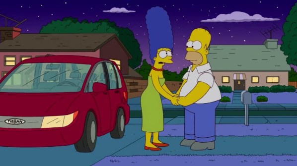 – The inspiration for Marge’s baby revelation is incredibly labored, the likes we haven’t seen from first acts in quite a while. Homer ignores fixing the leaky faucet in the yard for so long, its endless drips have eroded much of the earth beneath Springfield, resulting in a spread of sinkholes. Marge’s car falls into one, but she has a sinkhole preparedness kit, which is a gigantic inflatable staircase that leads them back to the surface. I guess it’s just good fortune that the sinkhole was exactly as deep as the staircase was tall. Marge and the kids fall down the hole, but then everything’s okay; there’s no danger or seriousness to this segment, it’s just an empty plot device to force Marge to have to buy a new car. Going for a test drive, Homer makes an offhand comment about how the car is the perfect size for their three-child family, and then, on a dime, Marge becomes incredibly uncomfortable and ultra-critical about problems with the car that don’t exist. It turns out it’s a psychological result of her wanting to have another kid. I get what they were going for with this, but it was handled very flimsily to me.