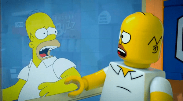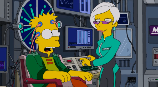 – The couch gag features the family running into a panel at Comic-Con, and Comic Book Guy asking if there will ever be another movie. The joke, I guess, is we see that everyone but Maggie has fled after the question is asked, leaving her worried. Or embarrassed. I can’t tell. But it’s basically a joke stolen from a Futurama episode four years prior, where Bender asks the same question to Matt Groening’s head in a jar, who fires a laser at him in response.