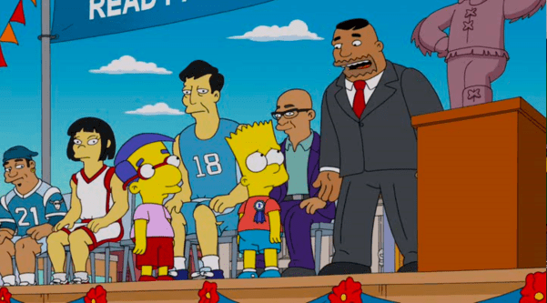 The reaction: Boy, what a whimper of an episode to have as your season finale. Springfield Elementary has an end-of-the-year race that the entire town holds in high regard for some reason. Remember when the school was a dumpy embarrassment? Milhouse trained hard for this, is in the lead, then the bullies, who had been taking bets on the winner, get worried that they’ll have to pay off Martin, who overheard Milhouse’s rigorous training and put down a huge bet on him, so they must sabotage the race. Why would they feel obligated to pay Martin at all? They’re fucking bullies. So Nelson corners him in the woods, beats him up, and Bart turns away and does nothing, as seen in an overly dramatic fashion. Then he ends up winning and feels guilty of taking the glory from Milhouse. It feels so belabored. Meanwhile, Homer teams up with an old hero of his, the man in charge of the annual fireworks display, to put on a big show, so that kills some more time. The two plots intersect at the show, when Homer and old man get into a fight for no reason, and the barge they’re on tilts perfectly ninety degrees, leaving the fireworks pointed directly at the crowd. How the hell is this happening? And is this supposed to be a moment of tension? You can’t have silly cartoon physics and expect us to treat this as seriously simultaneously. Bart views this as a way to redeem himself, and he drives a bus in front of the incoming fireworks, saving the day, and having Milhouse take the credit. Through this episode, we’ve seen two groups of crowds, one at the ceremony awarding Bart, and the other at the end on the beach. When Bart admits the truth about the race, the crowd fiercely boos. Agnes yells, “Bart’s a coward!” Krusty follows up, “He lied to us!” Forget why the whole town gives so much of a shit, but why are they saying this? Why the fuck does every single character just announce what they’re feeling or repeating what’s going on with the plot? It’s the same shit at the end. The crowd is saved from being set on fire, and Lenny, calm as can be, unprompted, to no one in particular, asks, “So who’s our hero?” When Milhouse exits the van, Sideshow Mel chimes in, “Milhouse is our unlikely savior!” Then a guy in the crowd yells, “Quit explaining everything!” Well, I guess we can chalk this up as an awful trope that the writers acknowledge is terrible, but will continue to use regardless. Is it too much to ask that maybe in the coming seasons, we’ll see a little bit less of this endless incessant over-explaining expository dialogue every single goddamn episode? Is it?