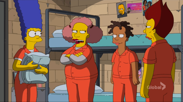 – Just like “Chains,” we devote time to Homer and the kids to see how they’re faring without Marge. But unlike the wonderful quick gag of the entire house going to shit within seconds, it’s multiple scenes of just bland nothingness. Neighbors chip in with gift baskets and baked goods to keep their spirits up, and eventually Homer decides he should probably get off his ass and do something, but not before envisioning a Ned/Marge hybrid to lust after. Between this and “Fland Canyon,” I guess these two are friends now? And like “Chains,” Marge makes friends with her fellow inmates, but none of the three pictured above have names or any real personality. Remember Philips? Tattoo Annie? And that was all within the last five minutes that Marge was actually in jail, compared to a whole two-thirds of this episode. Again, when the plots are this similar, it’s impossible not to think how fucking inept this is compared to the original.