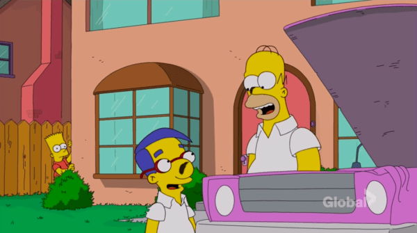 – Act two opens with Kirk orchestrating some kind of prank for Milhouse to film for America’s Funniest Home Videos (is that still a thing?), which of course goes horribly wrong, ending with Luann running him over with her car. From there, we go to Homer visiting his dad, then back to Bart playing monopoly with Leinart. I really wasn’t sure what that orphaned Van Houten scene was doing there, as it didn’t seem to connect with anything. But four minutes later, we finally get Homer and Milhouse bonding and I guess that’s what it was supposed to set up. But there’s no real logical lead-in to this. Milhouse didn’t seem all that discouraged by Kirk’s shenanigans, and there’s no real reason for Homer to take a shining to the kid. As usual, they just didn’t even bother.