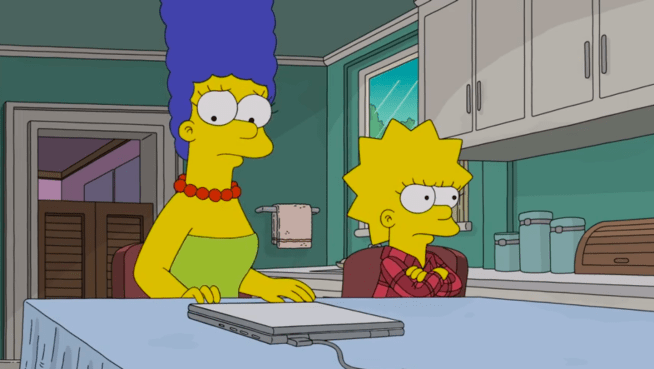 – Bart initially balks at Lisa demanding he tell Marge the truth. She rebuffs, “You don’t realize how bad this is, do you? You betrayed the one person who still believes in you.” Just when I thought they were going to actually have a nice Bart-Lisa moment where he reflects and processes what he’s done, we go into a silly, upbeat montage set to The Intruders’ “I’ll Always Love My Mama” featuring Homer tossing Bart into a lion’s den and Marge fending them off, and Marge helping Bart write his chalkboard punishment. Following that, Bart is aghast (“Oh my God! She’s shown me nothing but love! How do I make this guilt go away?”) Terrible. I think back to the great writing from episodes like “Marge Be Not Proud” where Bart and Lisa talk about how Marge’s anger and disappointment is manifesting in a different way (“Her heart won’t just wipe clean like this bathroom countertop. It absorbs everything that touches it, like this bathroom rug.”) And then when Bart asks how he can fix it, Lisa shrugs, because she’s an eight year old kid. What beautiful, realistic, and funny writing. It’s a true rarity when characters on this show actually talk or react in a fashion that feels like they’re believable people, rather than just joke-spewing automatons jittering about for twenty minutes until they run out of juice.