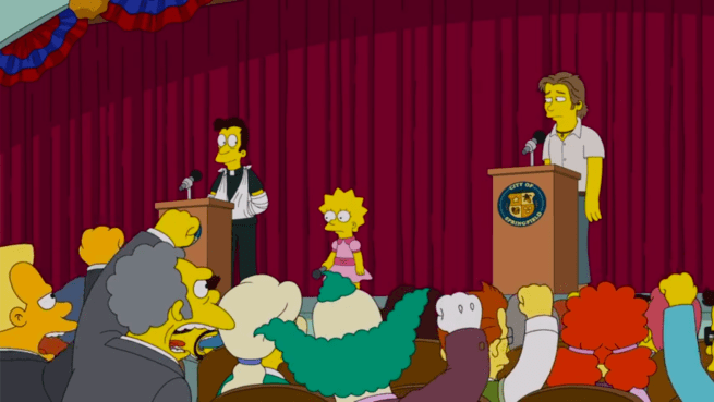 – In trying to convince Homer to let them go to Wolff’s seminar, Lisa opts for a new tactic (“Dad, I need to tell you something, but I’ve come to the sad conclusion that you have difficulty hearing the female voice.”) So she has Bart ask Homer for her, to which he understands and accepts. Many have griped and complained about Lisa’s insufferable rabble rouser characterization, of which most of those criticisms have been pretty valid, but this “joke” might be one of the strangest of all. So Homer’s a big misogynist now? They have him dismiss Lisa after that first line (“Awww, I love you too, honey!”) but he’s not ignoring her “female voice,” he’s talking down to her as a kid. There have been plenty of gags at Lisa and Bart’s expenses of him not taking them seriously because they’re children, so I really don’t get it. Maybe next season that radical girl group that recruited Bart can teach Homer how to GET WOKE. I CAN’T WAIT.
