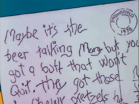 – Speaking of voices, I got incredibly sad hearing Marge speak for the first time. Julie Kavner’s voice has been on the downward spiral, but she just sounds so grated and tired here. I don’t know if this is a result of her recording from home rather than a studio, or maybe it feels “worse” because I’ve been watching the first couple seasons of the show lately, but it’s just a real bummer to hear. Having just turned 70 this year, Kavner’s been an absolute trooper through the entire series, and presumably she’s still in pretty good shape for her age, but Marge really is sounding more and more like her mother with each passing season.