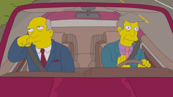 The reaction: One of my biggest wants over the past fifteen or so years for this show is for them to explore their enormous roster of secondary characters. I think we’ve had enough Homer and Lisa episodes for one lifetime, why not give us some variety and feature Ned Flanders, or Mayor Quimby, or in this case, Skinner and the Superintendent? Just like Comic Book Guy going to Comic-Con, a story with Skinner and Chalmers being stuck together feels like a promising idea, one I was genuinely curious as to how they would execute it. While it definitely felt novel to have an episode that barely featured the Simpsons at all, I was ultimately disappointed as to how bland and unambitious the episode ended up being. If you’ve seen any road trip comedy featuring two mismatched protagonists, you can basically predict the story beats here: the two bicker, meet up with odd characters and get into wacky shenanigans, one or two token acts bring them closer, a secret is revealed leading to a falling out, then a tearful reconciliation and everything is a-OK by the end. That’s not to say a traditional story can’t be engaging or fun to watch, but there’s not enough unique here that really kept my attention. Skinner resolves to have more backbone and be proactive in getting on Chalmers’ good side, and his kindness and quick thinking gets the two out of a few jams, which helps to make Chalmers grow more fond of him. Unfortunately it doesn’t seem like we learn a lot about these two during their trip. We see Chalmers freaking out about air travel, getting them kicked off the plane, but that never really develops into anything. Skinner finally standing up for himself to Chalmers was a little cathartic, but feels a little empty since there’s no real stakes for him in the episode. He tags along with Chalmers not for a promotion or a pay raise, he just wants to be his friend, I guess. This show has actually had some success in the past few years in showcasing new and different shades of our familiar characters (Mr. Largo and his partner’s domestic life, Krusty’s dream of filming an “unfilmable” adaptation of a sci-fi story), it’s just a bummer that this episode entirely focused on the secondary cast feels so rote and formulaic.