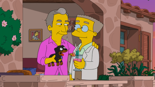 – The episode barely started and it was befuddling me. While channel surfing, Bart stumbles upon “Muttflix,” a cable channel made for dogs. Then we see there’s a streaming service UI on the screen, which seems obvious given the sub-MAD Magazine-level riff off Netflix. So is it a channel or a streaming service? This may seem like nitpicking, but when what I’m hearing is immediately contradicted by what I’m seeing, it just feels like the writers just don’t care. Then we get our triumphant return of She Biscuit, Santa’s Little Helper’s mother, last seen in the nauseatingly treacly season 31 finale “The Way of the Dog,” where she sits next to her son and does nothing. In that episode, we saw She Biscuit living with the Simpsons, but now Bart says Santa’s Little Helper “invited her over.” What? From where? I honestly couldn’t give a shit if she ever reappeared again, but they couldn’t even be bothered to write any kind of explanation of where she’s been. And why did she even need to be there anyway? The Muttflix sequence would have played exactly the same if it were just Santa’s Little Helper. Just dumb, lazy shit.