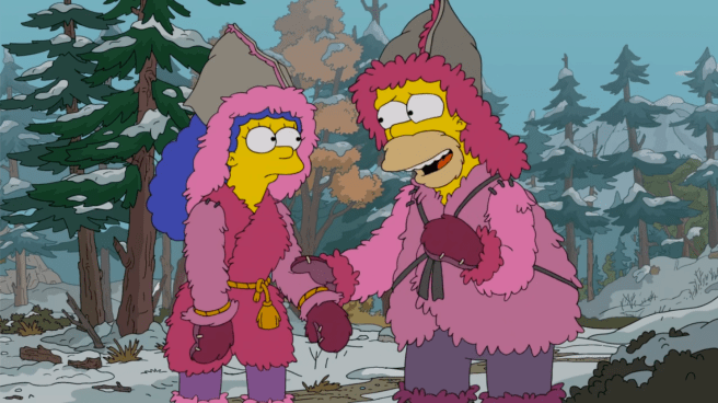 The reaction: Homer and Marge’s relationship has always been an interesting one, since as opposite as they may seem, there must be something between the two that keeps them together and loving each other. Despite her normally acting above it all, we’ve seen Marge be quite charmed by some of her husband’s more boorish qualities, and those little touches make their union seem all the sweeter. This episode opens with a similar sight, with the two completely comfortable with eating snacks while watching TV in a massive pile of blankets. While this sounds like paradise to me, Lisa is disturbed by this image, conflicting with her childlike view of marriage as a never-ending romance movie, urging her parents to take a week trip to “The Saffron Togetherness Center,” a phone-free relaxation retreat. All of this set-up feels promising enough, as I like to see Homer and Marge function as a loving team, grumbling about how the keto-diet and yoga-happy retreat schedule is of no interest to either of them. Then they crash their car and end up stranded with their wet clothes accidentally burned up, leaving them buck naked, apart from some helpful digital pixelation (hence the title. Originally I thought this was going to be a video games episode.) Homer and Marge eventually forge a “love nest” out of the remnants of an abandoned honeymoon villa, and even manage to catch a fish for food. The problem for me is that we don’t really get much of a progression of Homer and Marge’s characters through this story. If anything, it would have been better to start with them having some kind of petty argument, and them slowly softening to each other as the episode progressed and their love rekindling in such a dire situation. Or, they could be learning new things about each other in this brand new environment divorced from their suburban rut, realizing there’s still more to discover in each other even after ten-plus years of marriage. Instead, we see how they love each other in the beginning in their comfort with each other in mundanity (just not visible to Lisa’s immature eyes), and we end with them loving each other in a time of crisis. Homer ends up bashing in the skull of a feral wolverine about to attack Marge (which felt very uncomfortably real), sparking up their romantic flames once more. The two eventually follow snowmobile tracks back to a ranger station, enjoying a beautiful serene walk back to civilization, ending in one last cry of an embrace between the two of them, and a final view of the sunset while eating chips, mirroring their similar activity at the start of the episode. This is a Matt Selman show, so there’s your required dose of schmaltz, which doesn’t feel as egregiously manipulative as other episodes, but it doesn’t really feel potent to me since nothing really happened in to make it feel really earned. Like I said, we saw how close and in love the two of them were at the start of the episode, and by the end, they just realized how much they really love each other? I guess? The episode just felt very inert, and pretty laugh-less throughout. It once again brought up my “What even is this show now” question when it came to the last five minutes between the grisly manner of Homer killing that animal and their blissful walk back to the real world. I felt like the episode really needed to build up to that ending to really make it hit home, but it just didn’t to me. It reminded me a bit of the Futurama series finale “Meanwhile” (well, former series finale), where it ends with time frozen and Fry and Leela spend their lives walking across the entire planet, but that ending felt like a satisfying pay-off to the build-up of the episode, along with actually funny moments leading up to it. Like, okay, Homer and Marge love each other. We’ve seen them together for 33 years now. I’m totally onboard for an episode about them rediscovering that, but you’re going to have to give me more than the old “lost-in-the-woods” trope. It just felt very predictable and old hat.