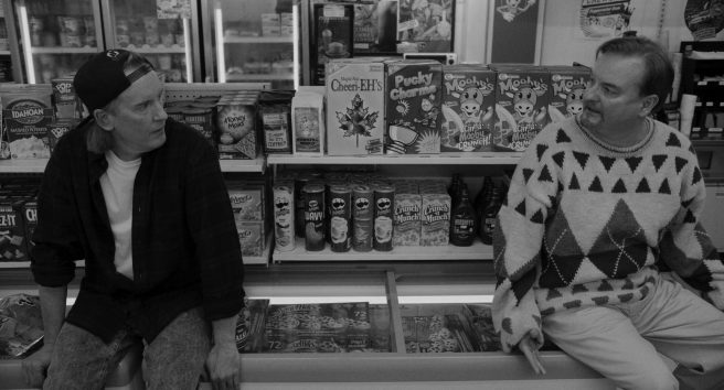 I’ve previously talked about legacy sequels, and how I feel kind of sad seeing older actors return to their classic roles to do the ol’ song and dance once more for our nostalgic amusement. Clerks III does that in spades. Marilyn Ghigliotti returns as Veronica, and all the Quick Stop and RST Video customers look like they’re all played by the original “actors” (or rather, friends of Smith and the crew they could get to come over one night to shoot a scene for free.) So when we see Dante pulling the Pringles can off a guy’s hand, the lady storming out of RST after Randal passively insults her, the Chewlie’s gum representative hawking his wares at the counter… everyone just looks so old. So, so old. To me, it’s not interesting seeing these scenes recreated like this, it just bums me out seeing them like this. On Future Day 2015, Michael J. Fox and Christopher Lloyd made an appearance on Jimmy Kimmel as Marty and Doc, having finally arrived in “the future.” I’m a humongous Back to the Future fan, and yeah, it’s great to see them together again, but even with source material I’m deeply connected with, it still had an undercurrent of sadness seeing how old and tired they looked. Like, if Kevin Smith had made a whole bunch of original movies post Clerks II, returning to do Clerks III might have felt like a novelty, but having this directly follow Jay and Silent Bob Reboot just feels a continuation of the ultimate regression, like he literally can’t think of anything to do other than just remake his first movie.