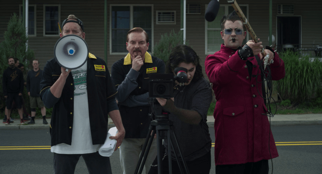 Also present is Elias from Clerks II, now in his 30s, working at the Quick Stop and hawking Christian NFTs, as well as kites with Buddy Christ on them, because reference. He and Randal banter early on in the movie, but as we just saw in Reboot, a lot of the spark of Smith’s signature writing is kind of gone. There’s some choice lines sprinkled throughout, but a lot of it feels like imitations of what these characters might say rather than anything authentic. Early in the movie, Elias has a crisis of faith and pledges loyalty to Satan, later showing up dressed in all black with heavy eyeliner and a pentagon necklace. From that point, his character basically devolves into putting him in increasingly sillier and more elaborate outfits, at one point looking like Alice Cooper with full face paint, a top hat and gothic finger claw jewelry. It wasn’t funny the first time he reappears as a Satanist, and it gets more and more eye-rolling as this running “gag” continues. He’s also got his own little buddy, “Blockchain Coltrane,” played by Austin Zajur (Kevin Smith’s daughter’s boyfriend), who doesn’t speak and just pantomimes for no real reason. Randal calls him Elias’s Silent Bob, except I don’t really know why he is. In Reboot, Milly having her own Silent Bob made sense since she’s Jay’s daughter, and it also fit the motif of the rebooted girl gang of having her best friend be a black deaf girl. Here, there’s no reason why this character shouldn’t speak, other than he’s just like another Silent Bob. Funny?