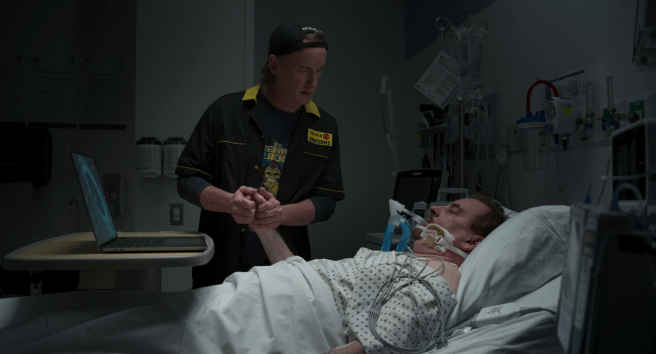 After we settle back into the Clerks world, Randal has his heart attack, and he is quickly whisked away to a hospital where he’s cared for by Dr. Landeheim (named after the real doctor who saved Kevin Smith’s life), played by Amy Sedaris. She shows up dressed as a witch, explaining she came to work from a costume party (a possible Clerks: TAS reference? In the third episode, we see the Mayor and police chief of Leonardo both arriving to press conferences in McDonaldland character costumes.) Sedaris does her best, but she’s not given much to work with. She tries to warm herself up to Randal by relating to his love of superheroes, but clearly doesn’t know a thing about them (she quotes Spider-Man’s “with great power…” line in a Batman voice.) She also operates on Randal while he’s still conscious, which I can’t imagine was the same as what Kevin Smith went through, but hey, I guess it’s possible. Also the nurse pictured above doesn’t speak, choosing to gesture to Sedaris instead (nurses famously do some of their best work non-verbally) So is she her Silent Bob too? Why is Kevin Smith doing this? We also get a Justin Long cameo playing an orderly, who is doing the strangest accent, almost like a midwestern Walter Matthau. It was really bothering me for his entire scene; not nearly to the sickening degree as Johnny Depp in Tusk, but it’s rare when you have a strong negative visceral reaction to an actor’s performance.