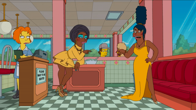 – There’s a final tag to the story where we see the person watching all these YouTube videos is George R.R. Martin, where we get an extended bit about how long it’s taking him to write his next book, making the writing staff officially the final people on the planet to make that joke. There’s also a weird tag where we see him watch another video of two drag queens (voicing themselves), but their designs look kind of weird. In comparison to the hostess in the scene, they almost look out of scale, particularly the one on the right. It’s a subtle distinction, and maybe it’s just me, but they look more like fan art “draw me as a Simpsons character” versus something actually feeling organic to the show.