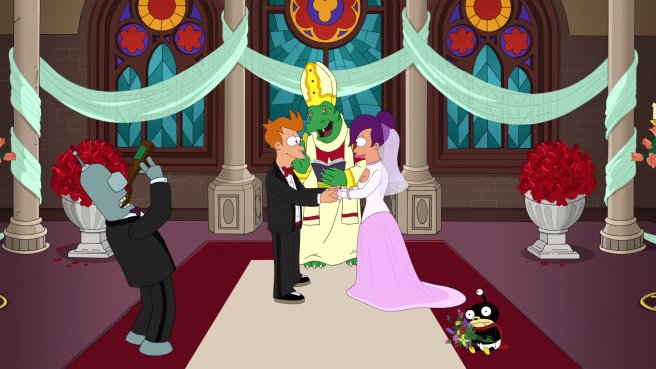 Why does Fry love Leela? Why does Leela love Fry? It’s something I wish the show did a little more groundwork on. In the ship teases in the first season, they seemed to be drawn to each other because of their isolation. Fry a 20th century outcast, Leela an unloved orphan, the two kind of gravitated toward each other in vulnerable moments because of their shared understanding of not belonging. As the show continued to develop, Fry and Leela’s personalities became more generalized, and later more exaggerated. Fry became a well-meaning, but intensely moronic man child, while Leela was the no-nonsense, occasionally impulsive captain, consistently rolling her eyes as Fry’s idiocy. However, there are moments throughout the show that feature Leela letting her hair down. Season 7’s “Fun on a Bun” has a lovely ending where Leela willingly makes a fool of herself at Fry’s behest (“Just this once, I’m going to let you embarrass me.“) Those are the instances I wish went explored a little deeper. There’s not enough moments in the show of Fry and Leela actually having fun together, sharing similar interests, anything that would help build something of a foundation for their eventual relationship.