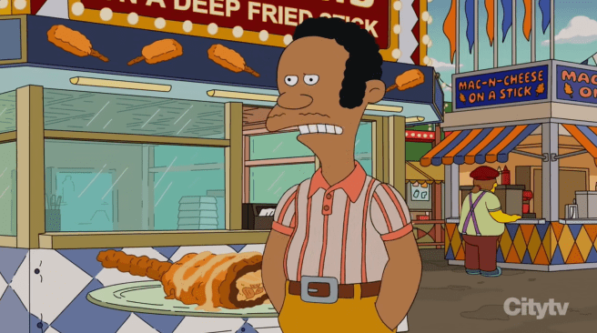 – Lou has always had a unique character design in that he’s got beady little eyes, at least compared to the big bug eyes of most of the rest of the cast. But his design in this episode was kind of inconsistent. In his first appearance in the Mayor’s office, his eyes are still smaller, but not so much so compared to the likes of Quimby or Moe. But from the fair onward, he’s got incredibly tiny eyes, maybe even smaller than he typically has. And they’re drawn so close together as well. I don’t know if he just looks “off” without his policeman’s cap on, but he definitely looked pretty weird to me.