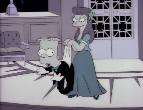 – I like Bart’s antics at the breakfast table: we all know the “see, food” trick, but Bart goes one step further by scraping the goop into Lisa’s cereal bowl. It’s the perfect trigger for another of Homer’s chest palpitations.