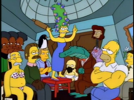 - “Homer, I want that thing out of my house.” I love the rare moments where Marge has just had it and stops being nice, and Homer compulsively kissing a confused senior citizen dressed like her son definitely feels like one of them.