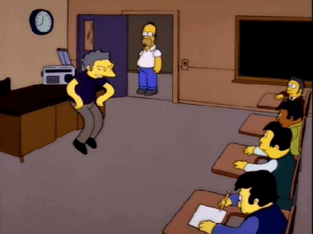 - I guess it makes sense that we go from Homer feeling bad people think he’s stupid to him wanting to be a teacher to get respect, but him proceeding to showboat and brag about it for multiple scenes feels very Jerkass Homer. Then seeing him actually in class just standing there and not doing anything… I dunno, it’s just not very funny to me. It helps if Homer is actually driven by something in his own story, not if he just feebly falls into the next plot turn.