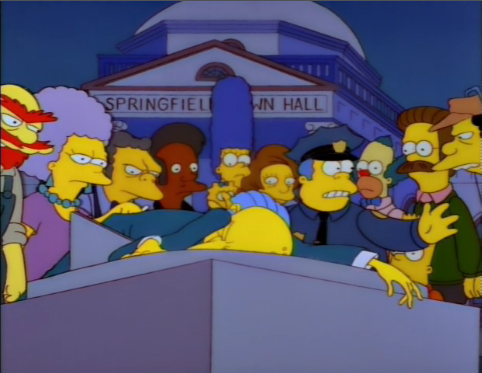 - Quimby’s plan to confront Burns is right out of the establishment Democrat’s playbook (“I have here a polite but firm letter to Mr. Burns’ underlings, who with some cajoling, will pass it along to him or at least give him the gist of it.”) His follow-up line is also fantastic (“Also it has been brought to my attention that a number of you are stroking guns. Therefore I will step aside and open up the floor.”)