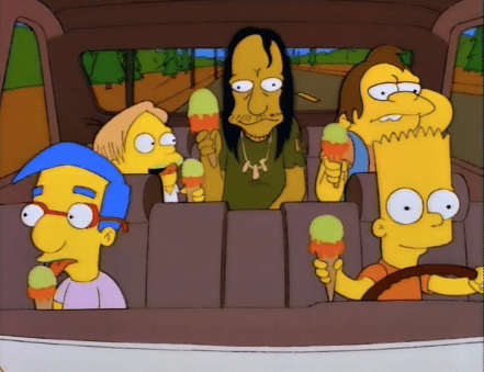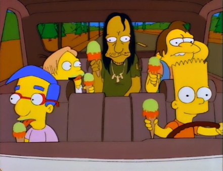 – Great flashback of Homer looking on at some cool kids in their tricked out van, dubbed the second-base mobile. Why not third, why shoot so low? The following sequence is so fantastic with the strobe effect of Homer getting closer and closer to the van, in the same standing position, and then clearly realizing he’s not wanted, and cut to him back far away again.