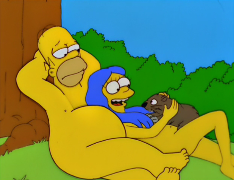 – Of course the photographer is Annie Lebowitz, who is oh so disturbed by every aspect of Homer. This subplot is filled with great bits: her Vaseline tub at the ready to slab all over the lens, “Light is… not your friend,” Bart and Milhouse at the window, and Homer’s horror at Marge being more interested in the decorations in the photos than of its erotic nature (“But I was gonna score!” “No you weren’t.”)