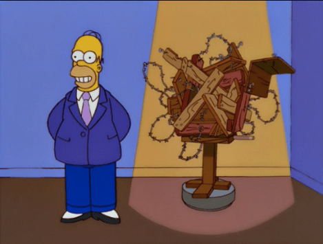 – Homer gleefully shows off his ill-gotten loot to Lisa (“Look! I got runner-up prize!” “You won second place?” “No, but I got it!”) He gets in a quick “Stealing is wrong” before he goes off to see his prize: a free boudoir photography session. Homer is intrigued. He looks up ‘boudoir’ in the dictionary. Then ‘photography.’ Then ‘boudoir’ again. It’s a well timed scene.
