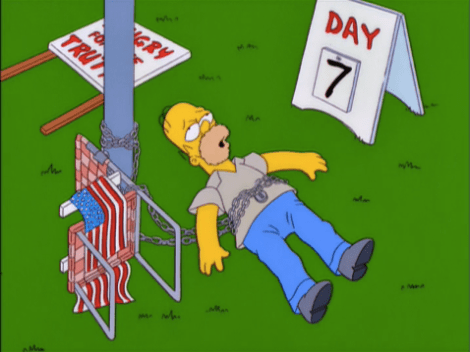 There’s also a side story here, but not much to report about it. After a visit from an eye-opening, but expensive, baby-proofer, Homer goes on a crusade to make the world a safe place for Springfield’s littlest ones. The reason? I’m not entirely sure, but you know that wacky Homer and all his crazy non-work-related adventures. There’s a strange scene before the baby-proofer shows up with him and Marge sitting at the kitchen table struggling to come up with something to talk about, with Marge about to point out that their marriage is suffering a bit before the doorbell rings. It’s a joke that kind of feels so sour and sad within this overly silly show. Be it filling a dangerous pool with Jell-O mix or bubble wrapping an entire playground, Homer is making waves in protecting youngins everywhere. So what’s the resolution? The answer is there isn’t one. Well, just barely. Homer sees on TV that many industries are being hurt by Homer’s crusade: Dr. Hibbert can’t afford a new boat because of healthy babies, the get-well-soon baby card factory has shut down, laying off hundreds. As such, Homer takes to the streets, calling for all infants to do their part and get injured. It’s not really an ending, it’s just an incredibly bizarre joke. Both stories in this episode has completely ridiculous climaxes, which takes away from any emotional connection or attempt at realism the plots had at the start. This episode had promise, but any goodwill basically evaporates come the third act.