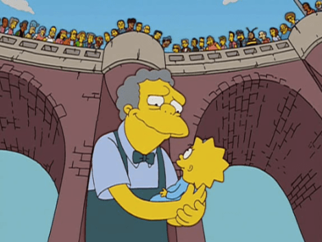 Nothing left for Moe than to commit suicide, I guess. This would eventually become one of his character quirks, because suicide is hilarious! Just as he’s about to jump off a bridge, Maggie comes falling down into his arms, having been flung from the Simpson car due to Homer being a shitty, inattentive driver. Moe is smitten with the little tyke, and eventually falls into the role as Maggie’s babysitter. The scenes between these two are absolutely adorable, with Moe still retaining his rough personality (“It’s so nice to be with someone who can’t understand the horrible things I say.”) The highlight is Moe’s story time where he regales the story of The Godfather using dolls, much to Maggie’s enjoyment. It’s not long before Homer and Marge start getting annoyed by how involved and overprotective Moe becomes of Maggie. The scene at the party really works showing how despite Moe being a bit overbearing, Maggie seems to have a stronger bond with him than her actual parents. But then they push things too far into a creepy realm by showing Moe has his own baby monitor and a video camera in Maggie’s room, which is the final straw for Homer, who tells Moe he’s not allowed to see her again.
