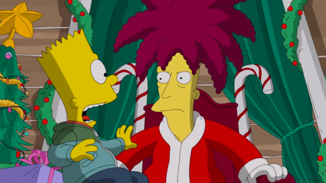 – There’s a kind of B-plot where Homer is terrified that his and everyone else’s jobs at the power plant are going to be taken over by robots. But I seem to remember an episode where that did happen. Season 23’s “Them, Robot” featured the entire staff getting replaced by automatons, leaving Homer the sole human employee left. I know it was eight years ago, but did everyone on staff just forget that this thing that Homer’s paranoid about happening and no one believes him… already happened? Homer’s main target of scorn is the break room’s new automated soda machine, and he tries to one-up it by pouring soda himself, and fuck, it’s so boring and stupid. Even though he passes out in his attempts, he’s quickly revived and announces that everyone’s jobs are safe, and everyone cheers for some reason. Then we pan over and see Burns is unleashing new robot workers into the plant. And that’s the end. What the hell is this? Again, we already did that episode, and it was a piece of shit.